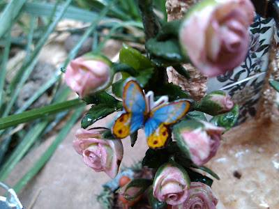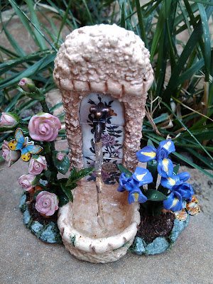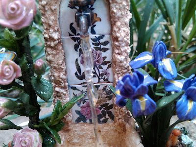 Los azulejos son papel pegado en cartón y barnizado. El agua está hecha con SCENIC WATER. Las flores con porcelana rusa y pintadas con pintura LA AMERICANA y todo barnizado en mate. Las mariposas son de papel plastificado. Y las piedras y tierra son para maquetas.