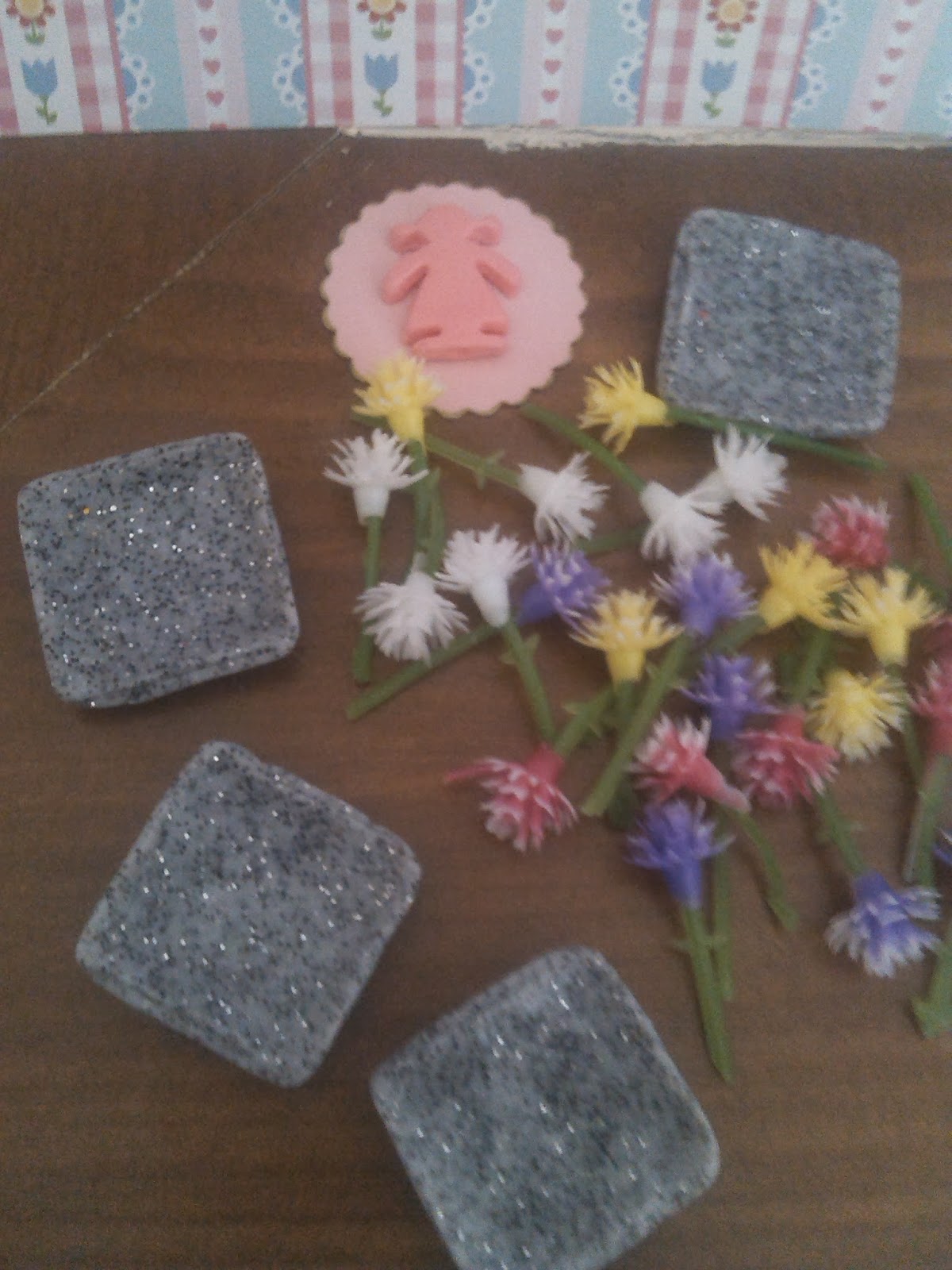 Y continuamos en el maravilloso mundo de las flores y, por si acaso se marchitan antes de tiempo, Sara me mandó dos moldes (que hizo ella) de dos hojas de distinto tamaño, y de una flor. Y claveles de repuesto para llenar los jarrones de las mesas. Un cuadrito infantil monísimo me empuja a pensar en una futura escena ... y antes de terminar la que llevo haciendo desde principios de agosto.